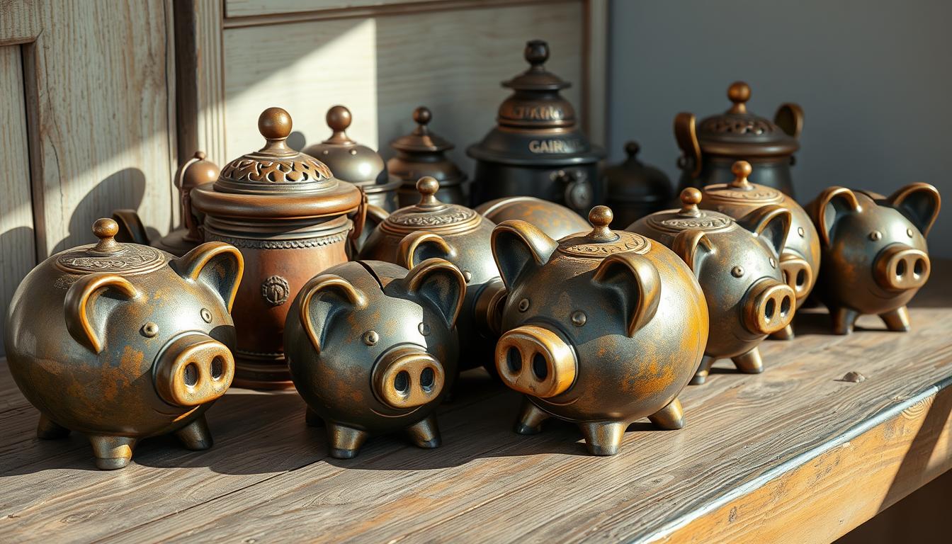 Antique metal piggy banks mix usefulness with beauty. Made from materials like cast iron or tin, they’re not just for saving coins. They remind us of childhood and the importance of saving. Let’s admire their workmanship and the tales behind them.