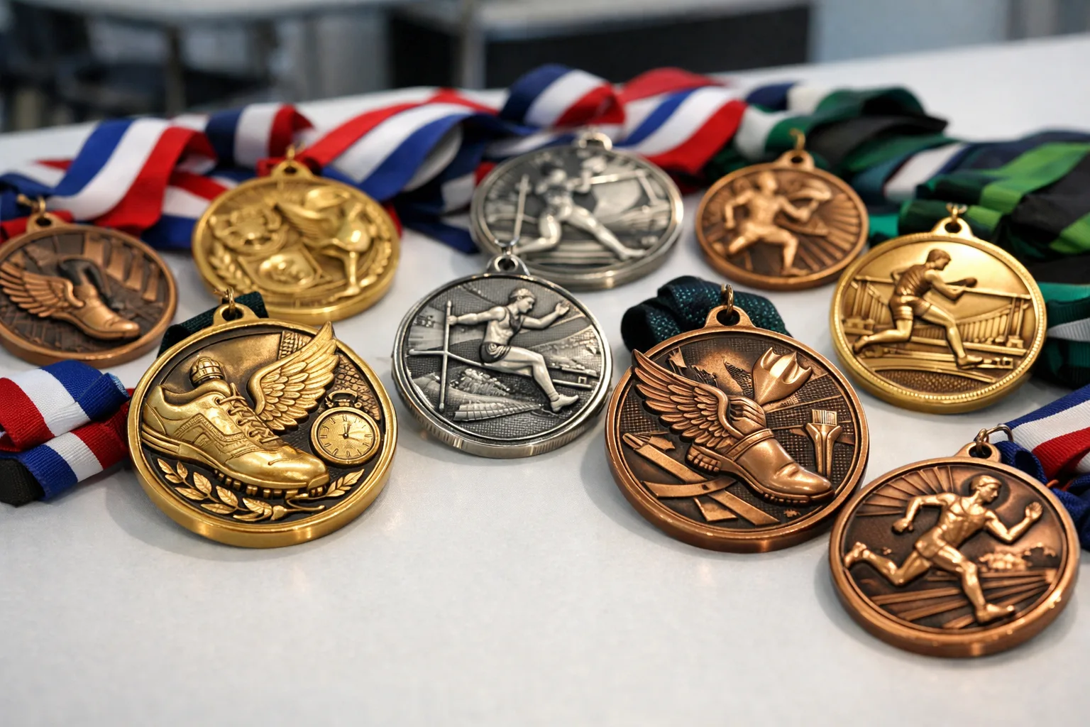 - Podium Medals: Use three-tier metal finishes (gold, silver, bronze), unique ribbon widths, raised numbering (1, 2, 3), and 3D relief.